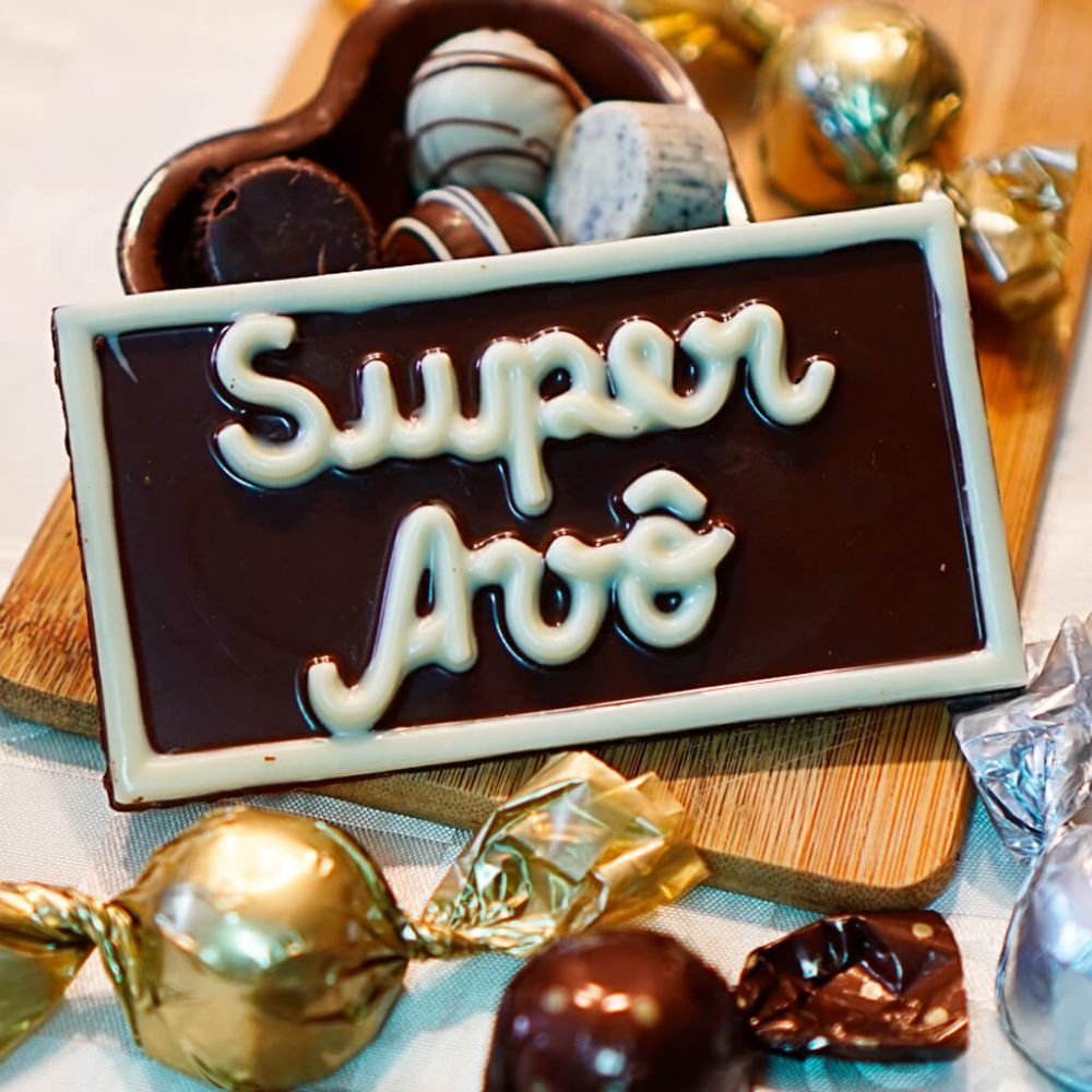 Barra de chocolate 40g com frases Super: Avô(ó), Mãe, Pai, Irmã(o), Afilhado(a), Genro, Nora, Cunhado(a), Dindo(a), Esposo(a), Filho(a), Namorado(a), Neto(a), Sogro(a), Tio(a).