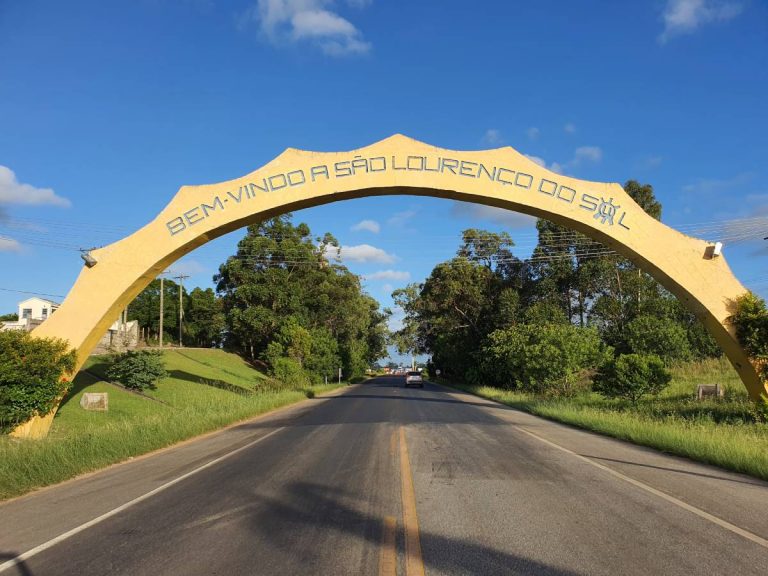 Lembrando o sol de suas praias, o pórtico saúda os que chegam à cidade de São Lourenço do Sul/RS Localização geográfica Fotos em 360º Vídeo